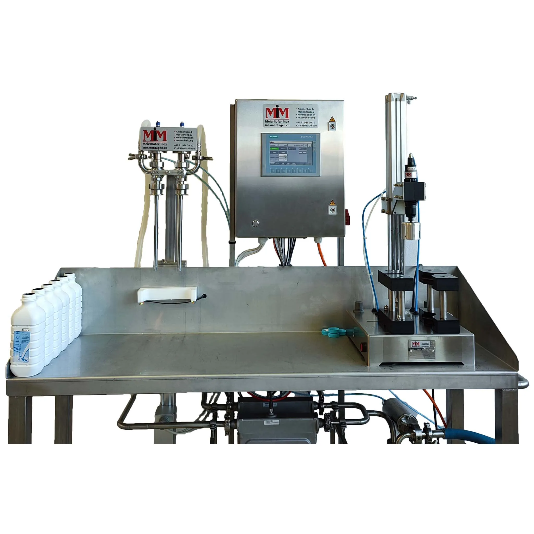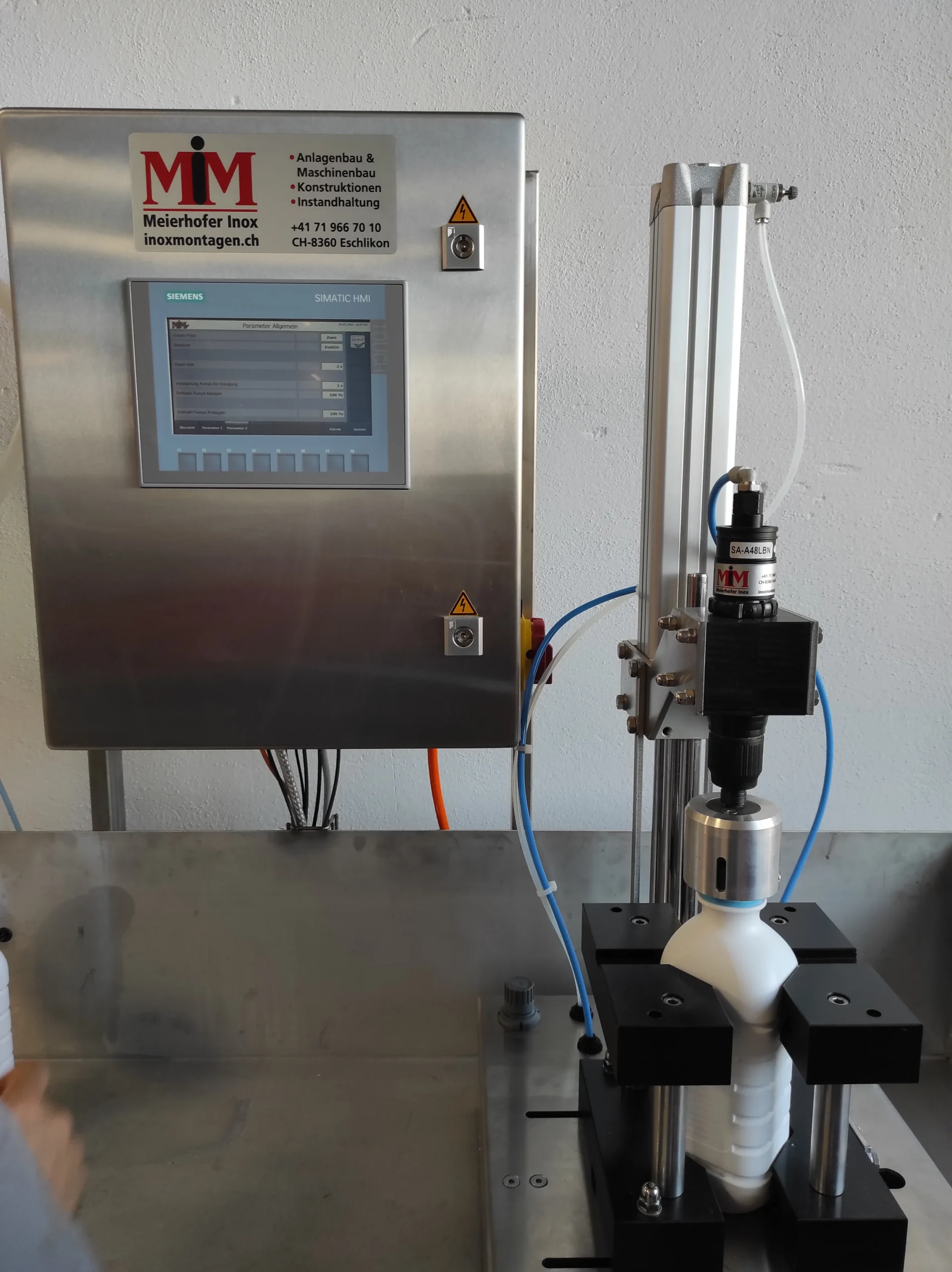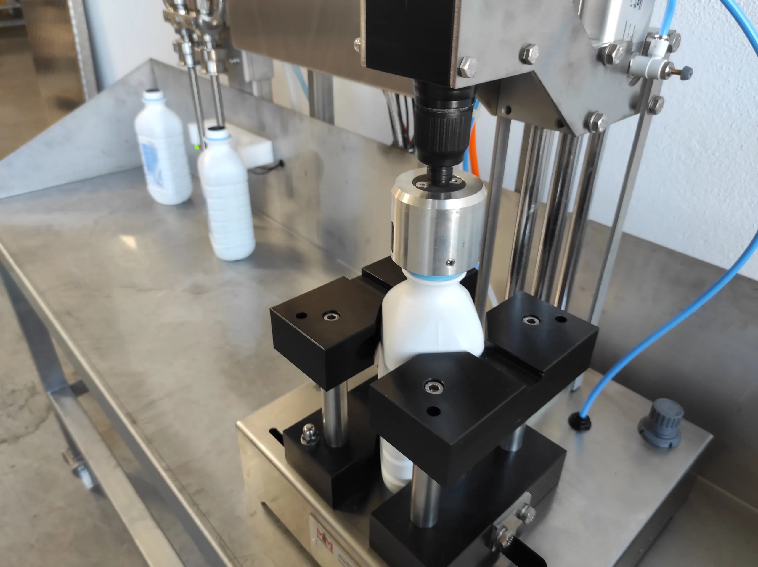 Durch Drücken des Starttasters auf dem Edelstahl Schaltschrank oder mit dem Fusspedal werden die beiden Flaschen automatisch mit der gewünschten Menge befüllt. Die Deckelung erfolgt über den Deckelverschliesser, gleich neben dem Flaschenfüller. Die Flaschen müssen von Hand vom Flaschenfüller in den Deckelverschliesser gestellt werden. Mittels Starttaster wird der Verschliessmechanismus gestartet.