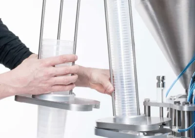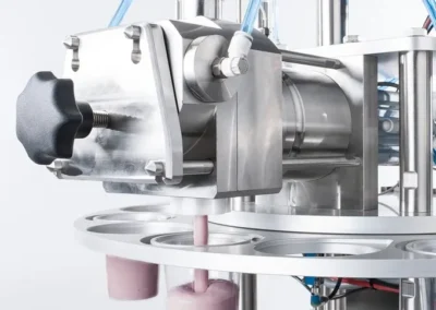 Der Rundläufer ist speziell für die Abfüllung und Dosierung von flüssigen Produkten (auch mit kleinen Feststoffen). Er ermöglicht eine präzise und effiziente Verarbeitung. Durch den Einsatz einer passenden Düse wird das Produkt genau und gleichmäßig in die Becher abgefüllt.