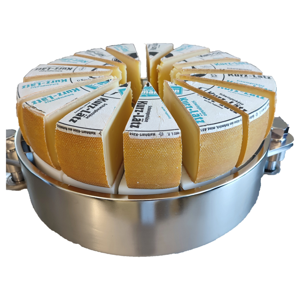 Die Käseschneidmaschine kann unterschiedliche Härtegrade und Grössen von rundem Käse schneiden. Geschnitten werden können 2 bis 15 Stücke.